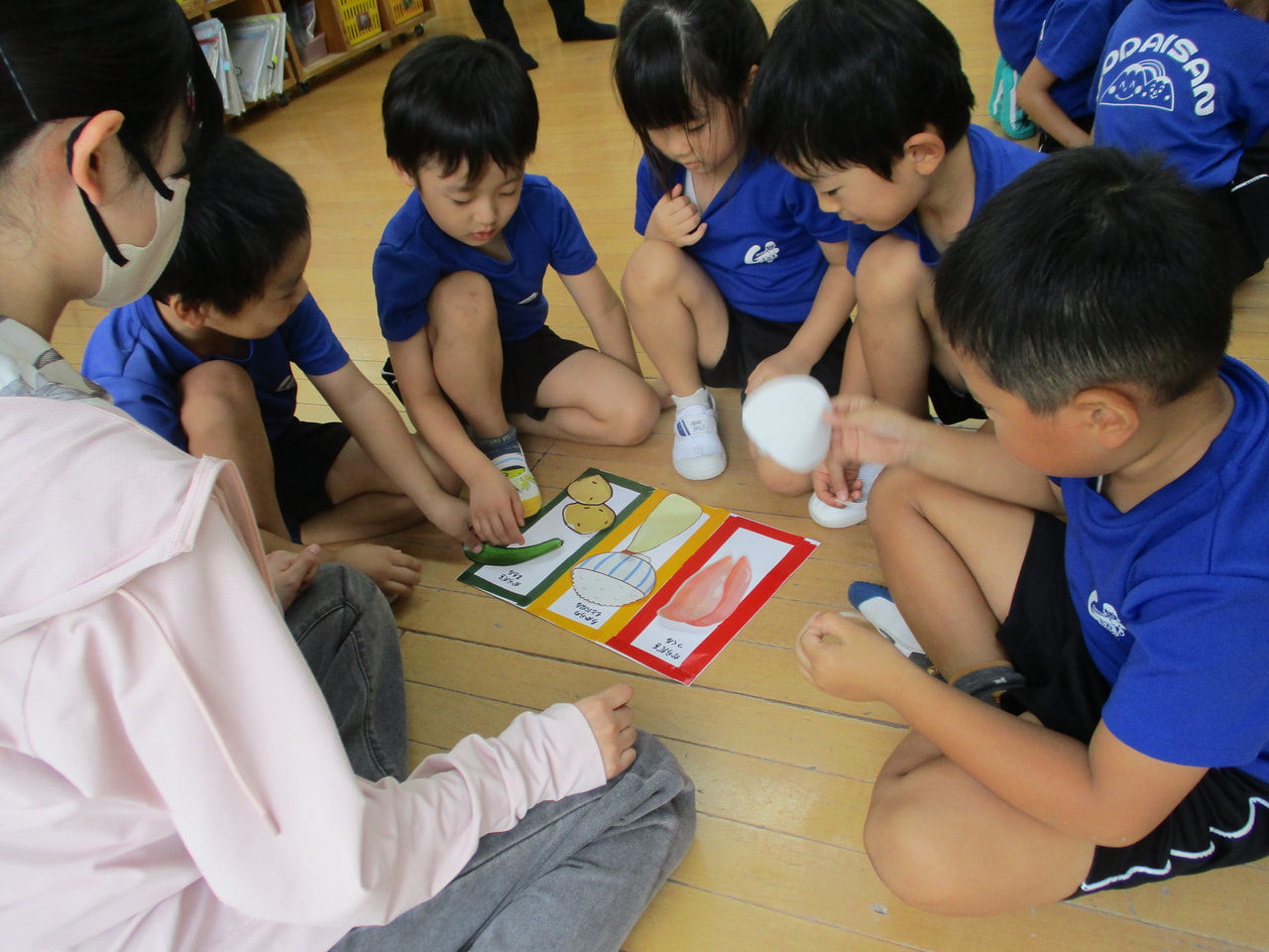 たべものを「あか、きいろ、みどり」の3つの色に分けて、それぞれどんなお仕事をしているかをグループごとにゲーム形式で考えました。