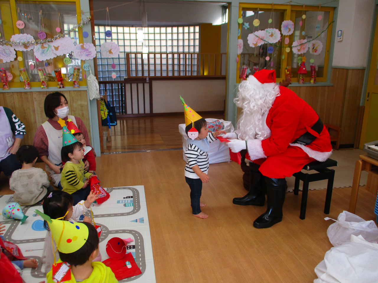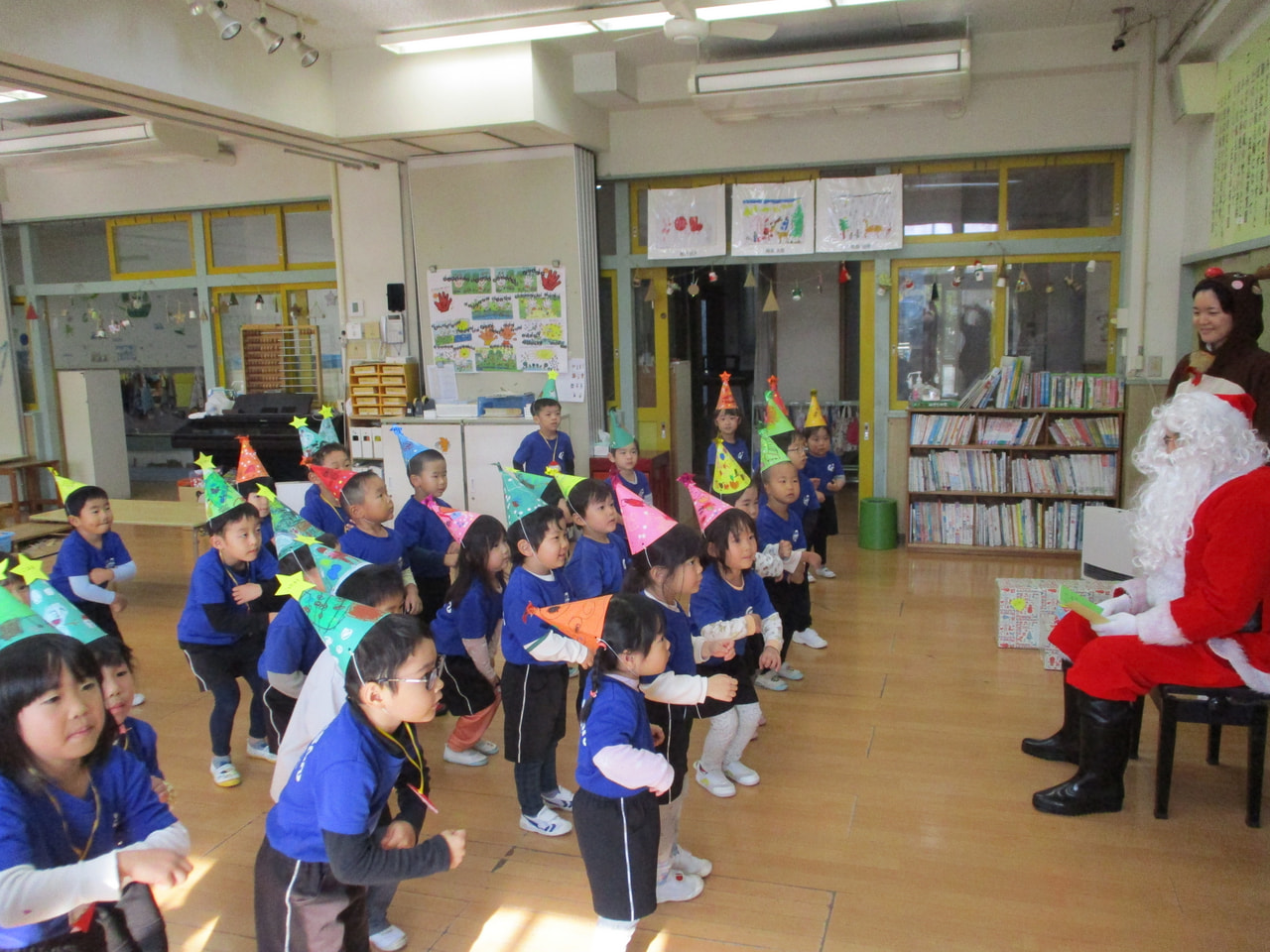 そして鈴の音が聞こえてきて、、、サンタクロースさんが登場!!子どもたちからは「うわ~!サンタさんだ~」の歓声が^^