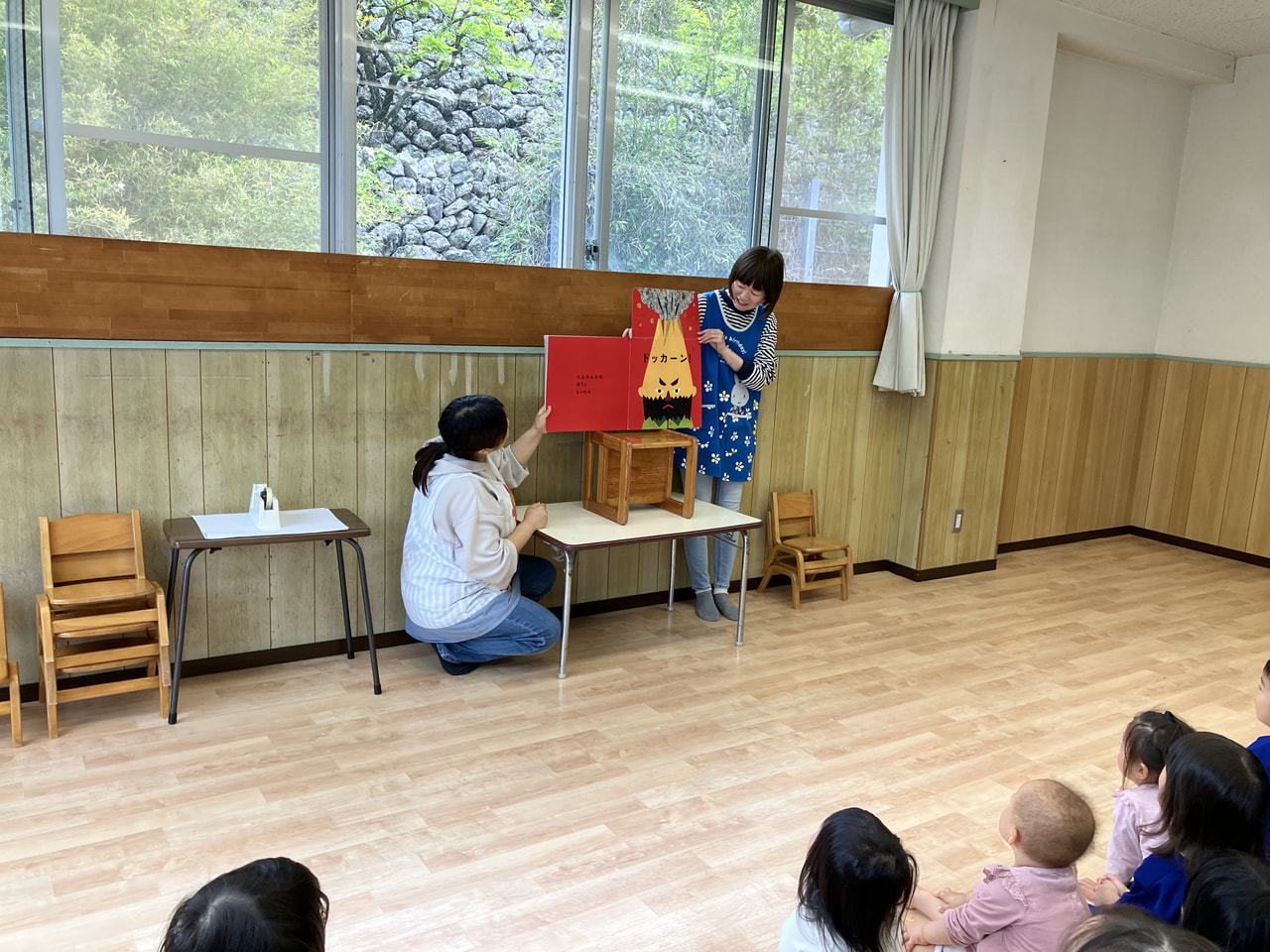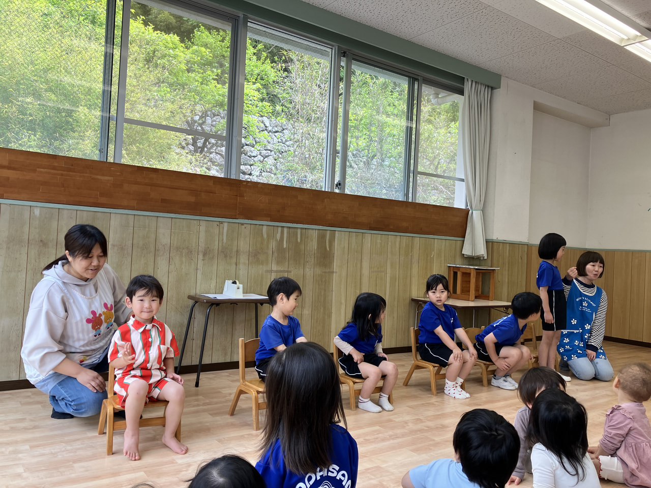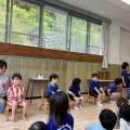 名前を呼ばれると、ちょっと恥ずかしそうにしながらも、しっかり前に出て「好きな食べ物は?」「大きくなったら何になりたい?」などの質問にも、元気に答えてくれて、みんなから拍手が起こりました。先生からの出し物では、大型絵本やクイズで盛り上がりました^^